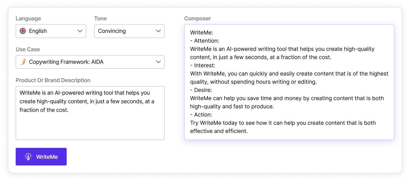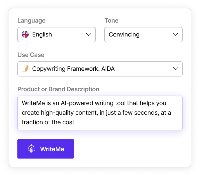 Input some relevant information for AIDA sales Copy generator. Input ideas such as product or brand description. Finally, simply click WriteMe!