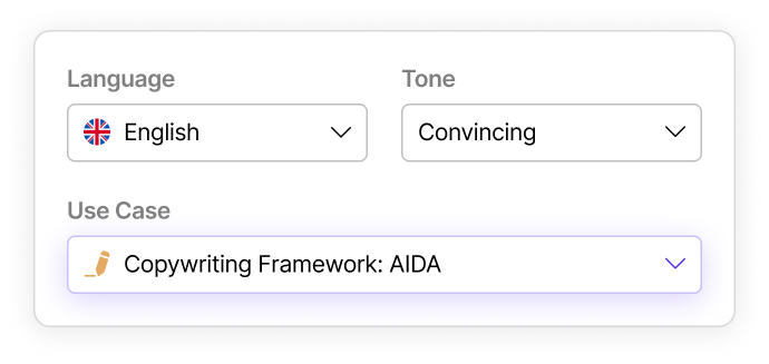 Tap on the choose use case option. Pick “Copywriting Framework: AIDA” from the drop down list containing 40+ different use cases.